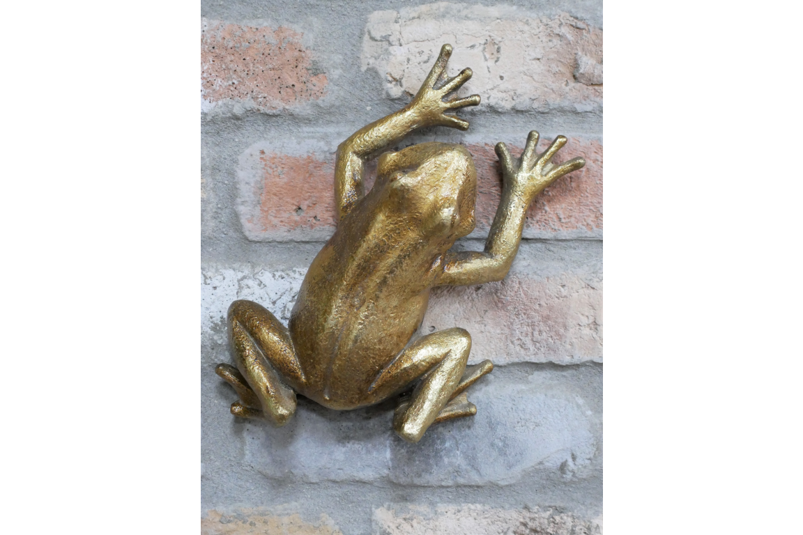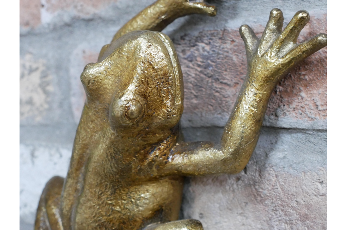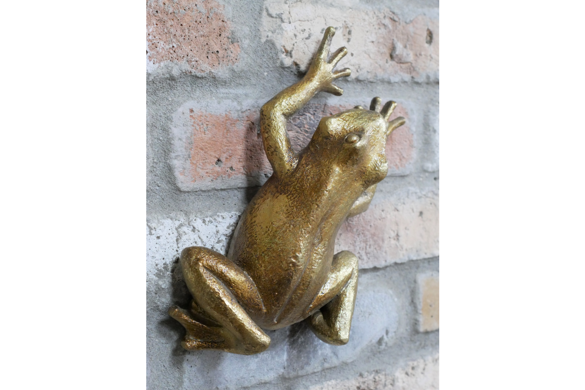 Bring a splash of personality to your garden wall or indoor décor with this striking gold climbing frog sculpture. Cast in a realistic pose and finished in a gleaming antique gold, this piece captures the lively spirit of nature in an elegant, eye-catching form. Crafted from durable materials for outdoor or indoor use, it’s perfect for adding whimsical charm to patios, fences, feature walls, or even bathroom spaces. A delightful conversation starter that’s sure to stand out.