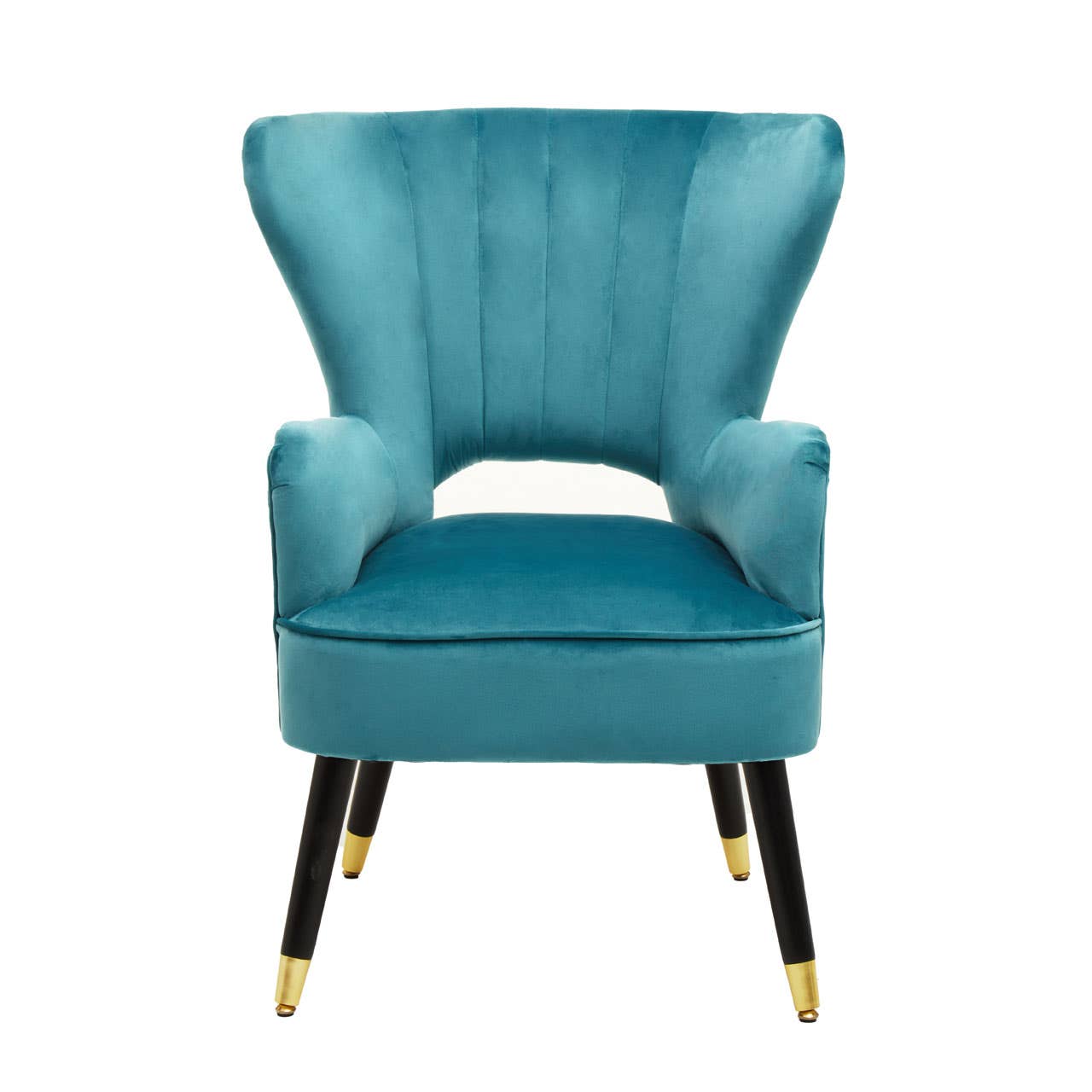 Description – Upholstered in green velvet, this armchair has a wingback with a cutout backrest for a comfy sitting experience. The angular rubberwood legs with gold polish tips will contribute to the mid-century modern style.