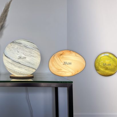 A marvellous chemistry of various elements seized in this spherical shape depicting a by product of the Earth’s constantly changing dynamics. When the lamp is illuminated, you can almost feel such formation unravelling.