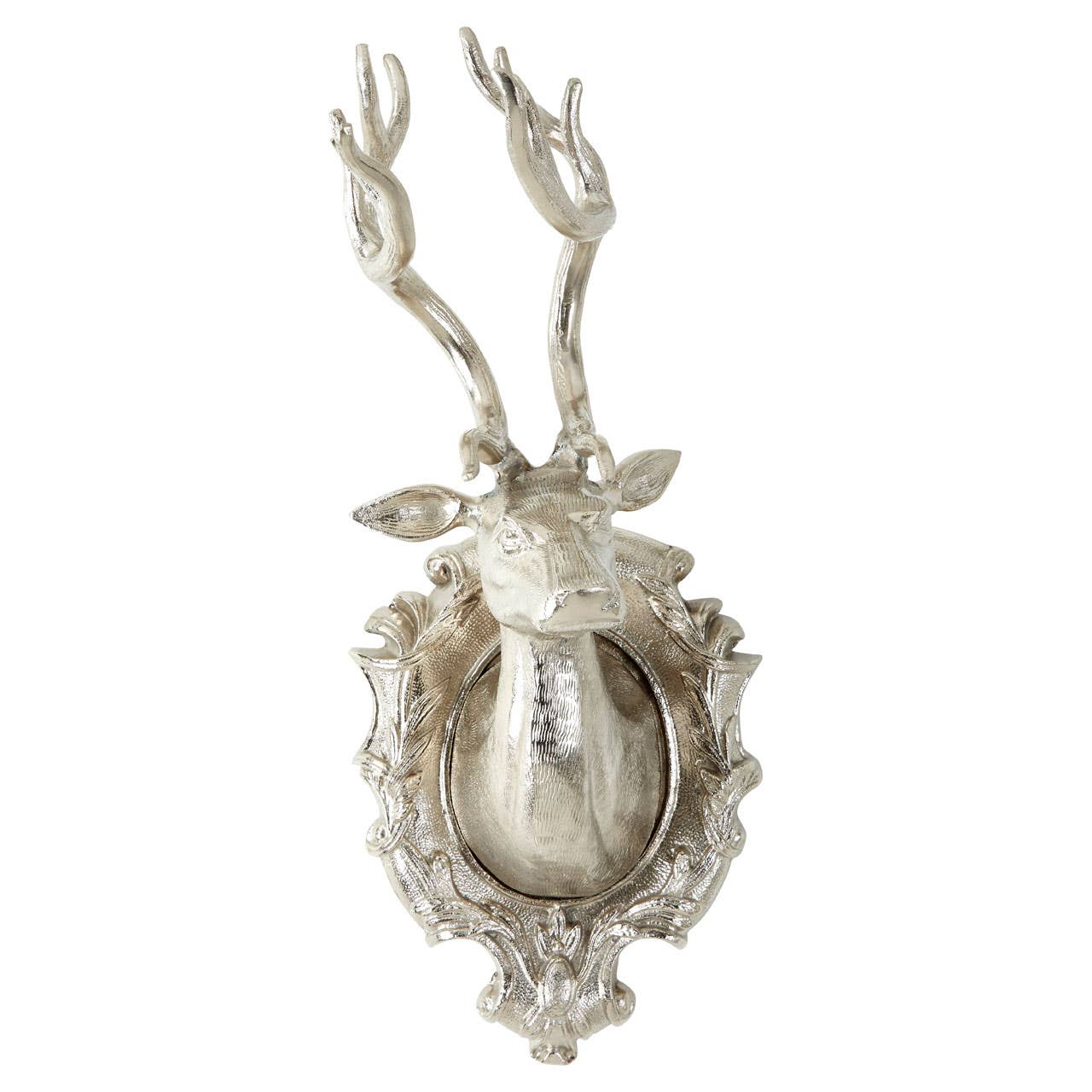 The stag head is set against a classical, cartouche-style mount, with foliage-style motifs garlanding its oval lines. This wall mounted stag’s antlers rise prominently for a dramatic effect. Made from strong aluminium, the piece has a nickel finish that accentuates its features and texture, and styles easily with silver metallic accessories.